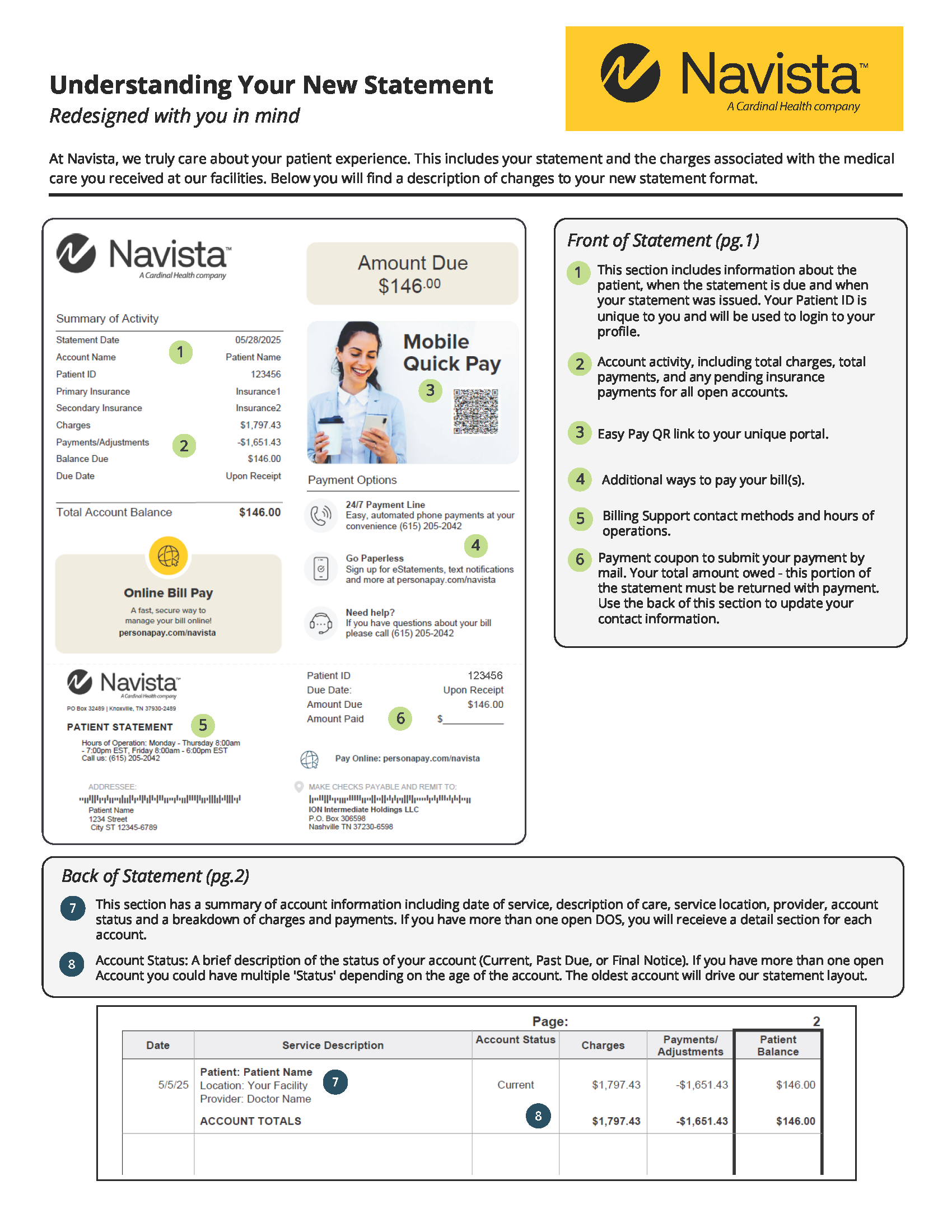 To provide you with a more friendly and expansive repayment experience, we have installed new technologies and payment avenues for you to utilize. Navista’s digital billing experience makes it easier than ever to view and pay bills related to your care, while also reducing paper waste. Following your visit, you will receive a text message or email with a link to our online bill payment site. From there, you can review your electronic statement and make a secure payment. Look for emails from @navista.com and texts from 629-356-5448.